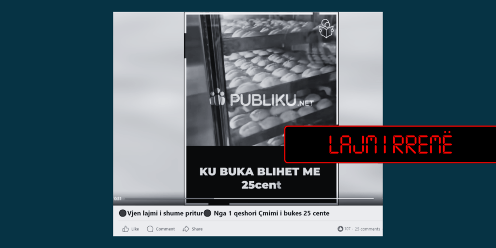 Faqja në Facebook me emrin “Publiku” ka publikuar dje një video nëpërmjet të cilës ka pretenduar se çmimi i bukës në Kosovë do të bjerë në 25 centë nga data 1 qershor.