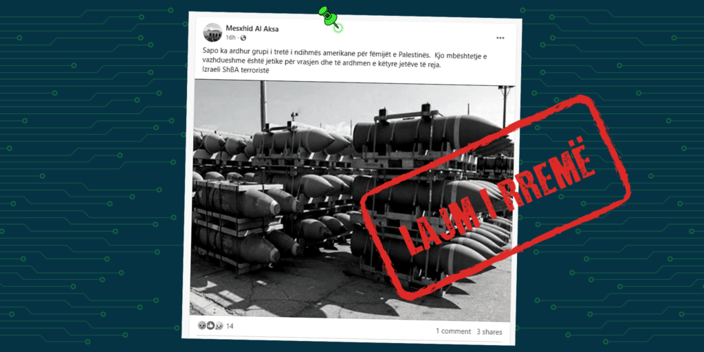 Një faqe në Facebook me përmbajtje në gjuhën shqipe që mban emrin “Mesxhid Al Aksa” ka publikuar një imazh në të cilin paraqiten disa armë (bomba), me anë të së cilës pretendohet se ato i janë dhënë donacion Izraelit nga Shtetet e Bashkuara të Amerikës (SHBA).
