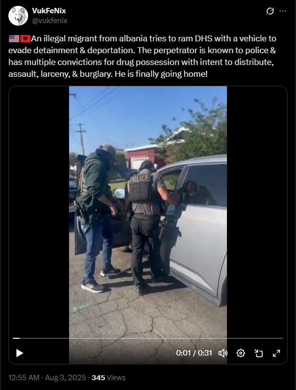 Një migrant i paligjshëm nga Shqipëria përpiqet të godasë DHS-në me një automjet për t’i shpëtuar ndalimit dhe deportimit. Autori i krimit është i njohur për policinë dhe ka dënime të shumta për posedim droge me qëllim shpërndarjeje, sulm, vjedhje dhe vjedhje me thyerje. Ai më në fund po shkon në shtëpi.