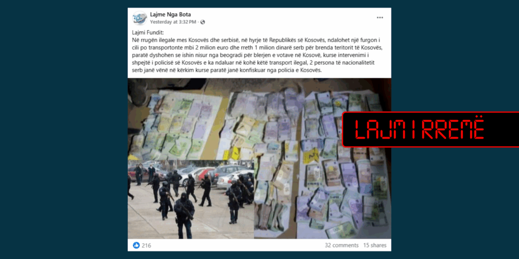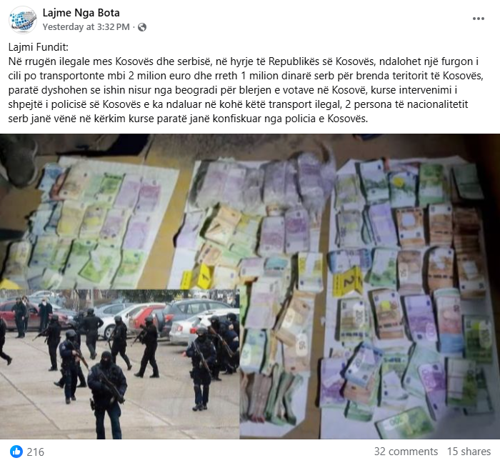 Përmes një postimi të publikuar të shtunën (27 dhjetor) në Facebook nga llogaria “Lajme Nga Bota”, pretendohet se në një rrugë ilegale nga Serbia, në hyrje të Kosovës, Policia e Kosovës ka ndaluar një furgon që po transportonte mbi 2 milionë euro dhe rreth 1 milion dinarë serb, të dyshuara se ishin destinuar për blerje votash.