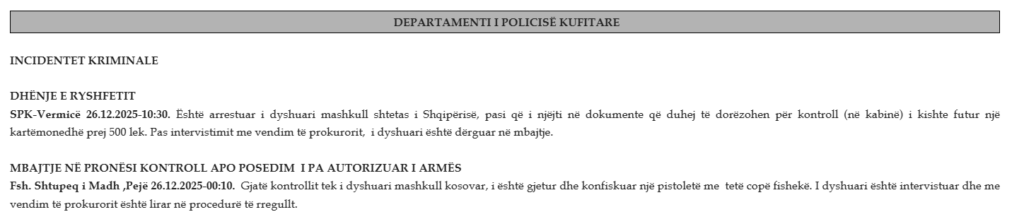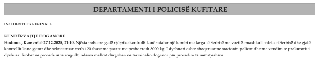 Po ashtu, në raportet 24 orëshe të dy ditëve të fundit (26, 27 dhjetor) të lëshuara nga Policia e Kosovës (DEPARTAMENTI I POLICISË KUFITARE), nuk gjendet raportim për ndalim të ndonjë transporti illegal të parave nga Serbia. (shih fotografitë më poshtë)