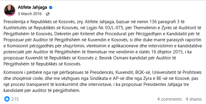 Pas hulumtimit të kryer online, hibrid.info gjeti se me datë 3 mars 2016, ish-presidentja e Kosovës, Atifete Jahjaga, i kishte propozuar Kuvendit të Republikës së Kosovës, Besnik Osmanin, kandidat për Auditor të Përgjithshëm të Republikës së Kosovës. (shih këtu)