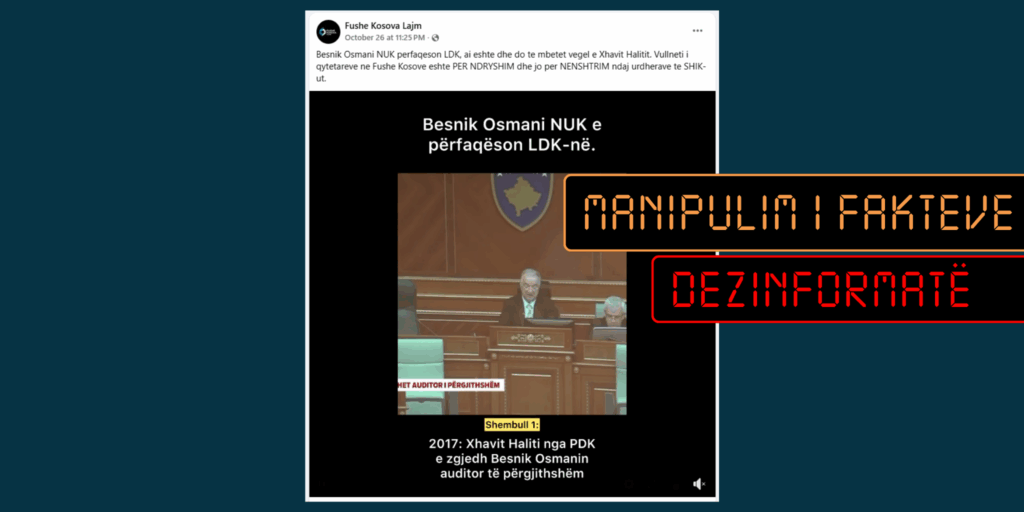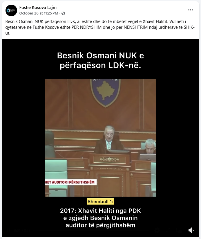 Të dielën (26 tetor), faqja “Fushë Kosova Lajm” (arkivuar) në Facebook publikoi një video-material 26 sekonda, përmes së cilës pretendohet se kandidati për kryetar të Fushë Kosovës nga radhët e Lidhjes Demokratike të Kosovës (LDK), Besnik Osmani, nuk përfaqëson LDK-në, pasi i njëjti ishte zgjedhur auditor i përgjithshëm nga Xhavit Haliti, i cili vjen nga Partia Demokratike e Kosovës (PDK).