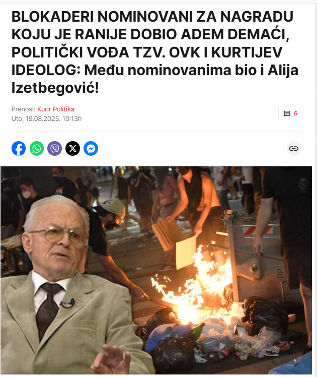 Kurir (19 gusht) raportoi: “BLOKADERI NOMINOVANI ZA NAGRADU KOJU JE RANIJE DOBIO ADEM DEMAĆI, POLITIČKI VOĐA TZV. OVK I KURTIJEV IDEOLOG: Među nominovanima bio i Alija Izetbegović! (Bllokuesit të nominuar për çmimin që më parë e mori Adem Demaçi, udhëheqësi politik i të ashtuquajturës UÇK dhe ideologu i Kurtit: Mes të nominuarve edhe Alija Izetbegoviq!”), duke zgjeruar narrativën edhe me figura të tjera historike si Izetbegoviqi, i paraqitur si “kriminel lufte” dhe “islamist”. (këtu)