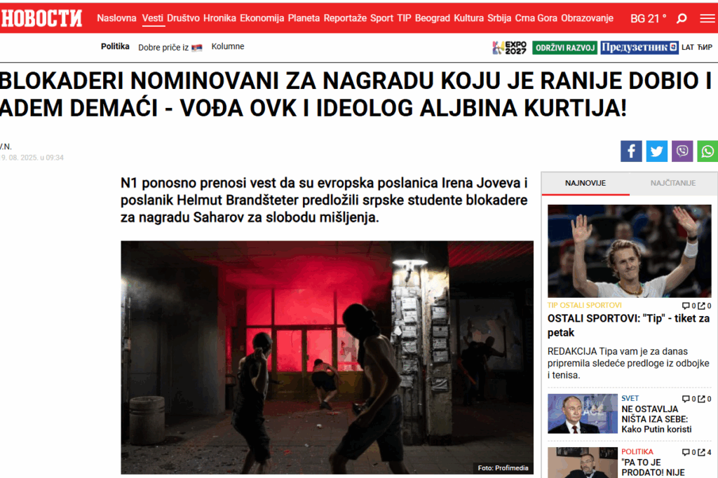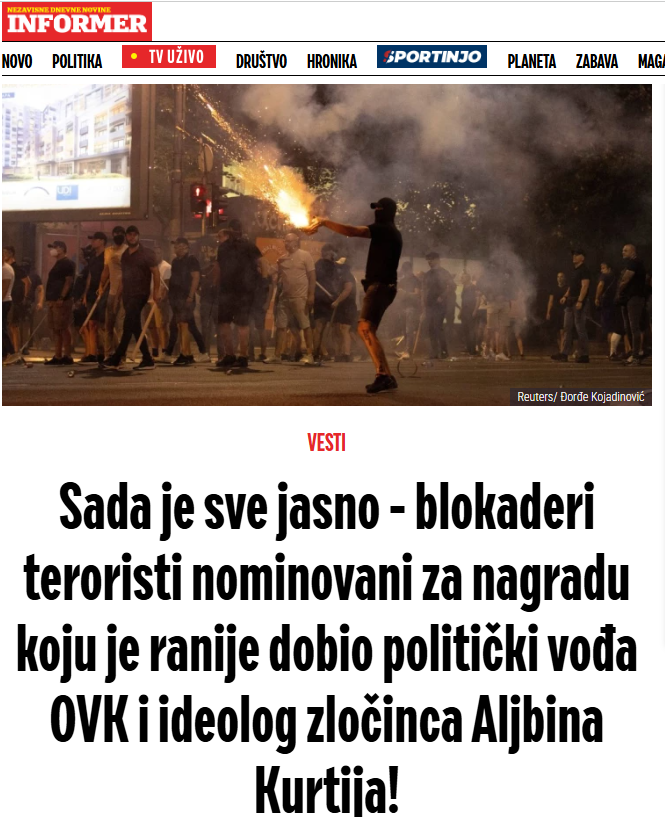 Informer (19 gusht) shkroi: “Sada je sve jasno – blokaderi teroristi nominovani za nagradu koju je ranije dobio politički vođa OVK i ideolog zločinca Aljbina Kurtija! (Tani gjithçka është e qartë – bllokuesit terroristë të nominuar për çmimin që më parë e mori udhëheqësi politik i UÇK-së dhe ideologu i kriminelit Albin Kurti!”). Në tekst protestuesit paraqiten si “bllokues të dhunshëm” që “po terrorizojnë qytetarët e Serbisë” dhe lidhen drejtpërdrejt me “krimet e UÇK-së” dhe me Kryeministrin aktual të Kosovës. (këtu)