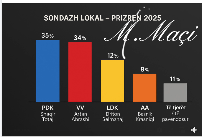 Sipas “sondazhit”, gara në Prizren paraqitet e ngushtë midis Shaqir Totajt nga PDK (35%) dhe Artan Abrashit nga VV (34%), ndërsa LDK me Driton Selmanajn renditet me 12% dhe AAK me Besnik Krasniqin me 8%. Publikimi e përshkruan garën si “duel politik kokë më kokë” dhe e interpreton Prizrenin si qytet që po “teston balancën mes traditës dhe ndryshimit”. (këtu)