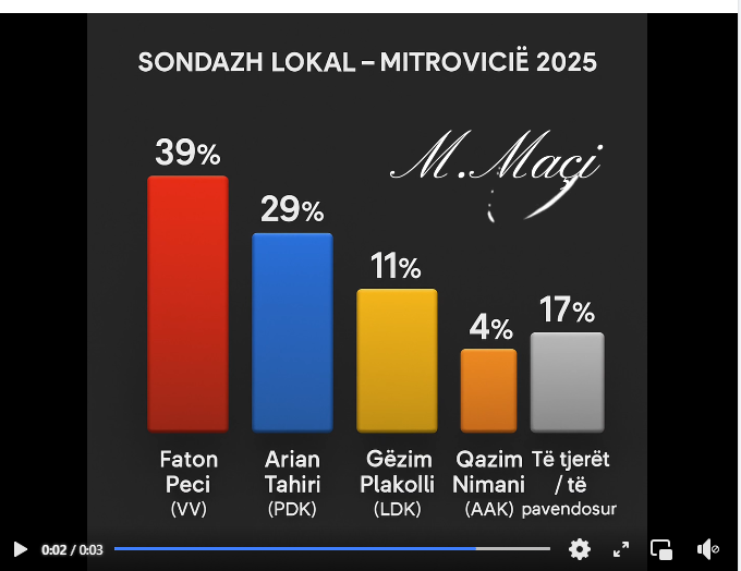 Në Mitrovicë, “sondazhi” e vendos në krye kandidatin e VV-së, Faton Peci, me 39%, përpara Arian Tahirit të PDK-së me 29%. Kandidatët e LDK-së dhe AAK-së renditen me përqindje të ulëta, përkatësisht 11% dhe 4%. Postimi e përshkruan këtë garë si një “epërsi të qartë” të Vetëvendosjes, por as në këtë rast nuk paraqiten të dhënat bazë që do ta bënin sondazhin kredibil. (këtu)