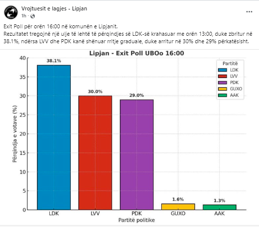 Një rast i ngjashëm është vërejtur edhe në një postim të faqes “Vrojtuesit e Lagjes – Lipjan”, ku pretendohet se paraqiten rezultatet e një Exit Poll-i për orën 16:00, sipas të cilit LDK printe me 38.1% të votave. Në përmbajtje përmendet kompania “UBO Consulting” si burim i të dhënave.