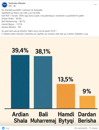 Një prej postimeve, i publikuar rreth orës 17:25 nga faqja “Suhareka Aktuale”, përmban një grafikë që pretendon të tregojë rezultatet e një Exit Poll-i, ku në krye paraqitet kandidati i Lidhjes Demokratike të Kosovës (LDK), Ardian Shala.