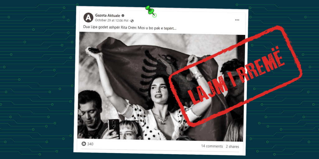 Disa Faqe në Facebook kanë publikuar imazhin e Dua Lipës me mbishkrimin: “Dua Lipa godet ashpër Rita Orën: Mos u bo pak e tepërt…”, duke pretenduar se këngëtarja ka thënë diçka të tillë.