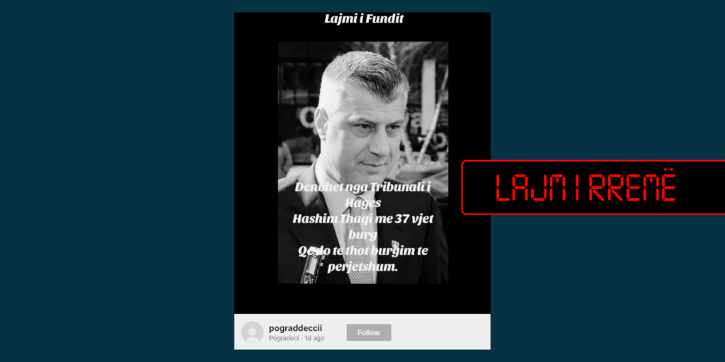 Publikohet një video-material, me mbishkrimin që pretendon se ish-presidenti i Kosovës, Hashim Thaçi, i cili po gjykohet në Hagë nën akuza për krime ndaj njerëzimit, është dënuar me burgim të përjetshëm.