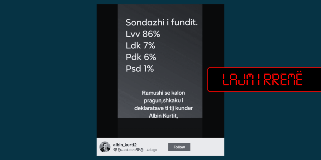 “Sondazhi i fundit. Lvv 86%, Ldk 7%, Pdk 6%, Psd 1%. Ramushi se kalon pragun, shkaku i deklaratave ti tij kunder Albin Kurtit,” shkruhet në publikimin e llogarisë “albin_kurti2” në TikTok.