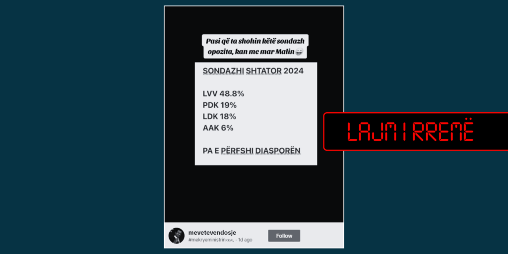 Nëpërmjet një publikimi në TikTok është pretenduar për një sondazh lidhur me zgjedhjet parlamentare që pritet të mbahen më 9 shkurt 2025 në Kosovë. Publikimi u bë nga llogaria “mevetevendosje” më 22 shtator.