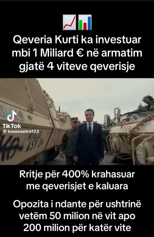 Një video e publikuar në TikTok paraqet pamje të kryeministrit Albin Kurti pranë automjeteve ushtarake dhe aktivitete të Forcës së Sigurisë së Kosovës (FSK), me mbishkrimin që pretendon se gjatë qeverisjes së tij janë investuar 1 miliard euro në armatim, duke shënuar rritje prej 400% krahasuar me qeveritë e kaluara.