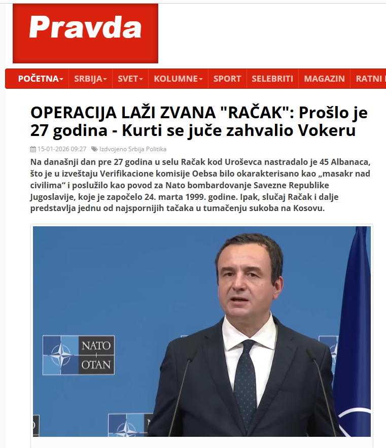 Pravda.rs e ka cilësuar ngjarjen si një “operacion i gënjeshtrave”, duke pretenduar se vdekja e 45 shqiptarëve ishte rezultat i një konflikti të armatosur dhe jo masakër mbi civilët.