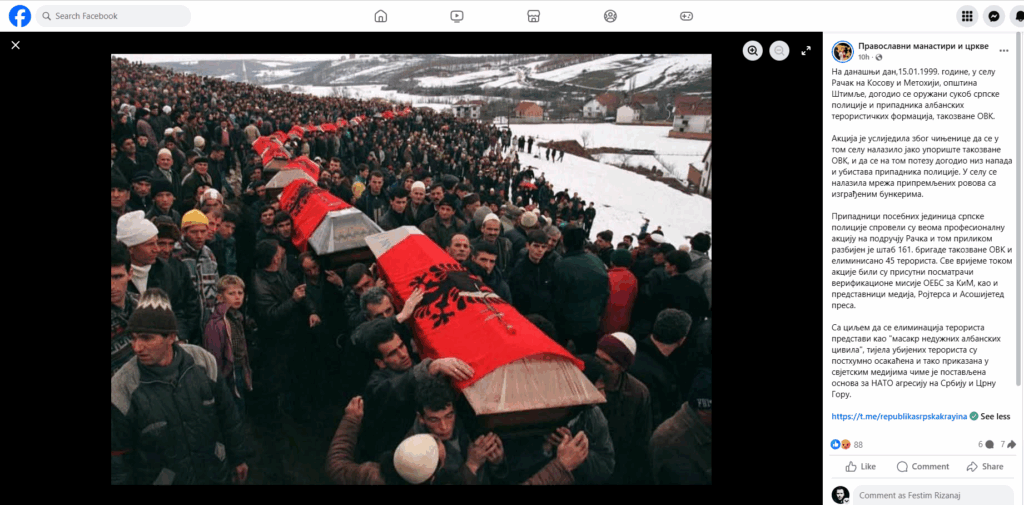 Përveç mediave, në rrjetet sociale Facebook dhe Telegram po qarkullojnë postime në gjuhën serbe lidhur me ngjarjen e Reçakut.
