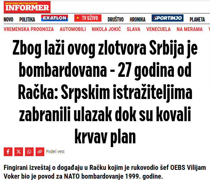 Blic.rs ndjek një linjë të ngjashme, duke theksuar se rasti “Reçak” ishte vetëm një pretekst i sajuar nga një diplomat amerikan për të nisur bombardimet e NATO-s.