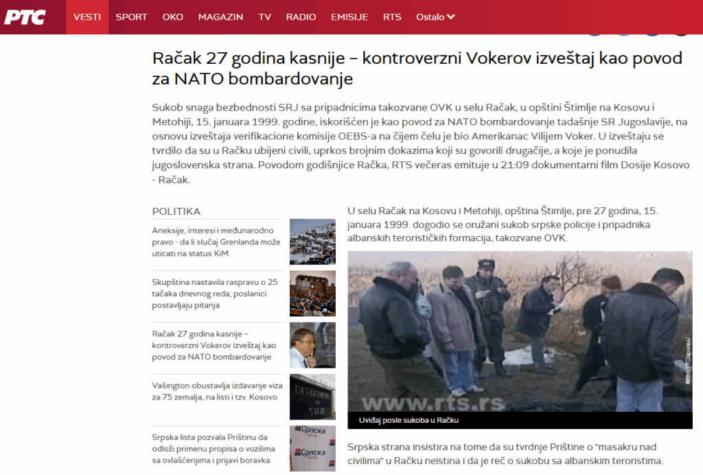 Edhe transmetuesi publik, RTS, i është bashkuar kësaj vale revizionizmi. Në artikullin e tyre “Reçaku 27 vite më vonë”, ata i referohen ngjarjes si një “konflikt me UÇK-në” dhe paralajmërojnë dokumentarin “Dosje Kosova – Reçak”, i cili synon të legjitimojë versionin e shtetit serb.