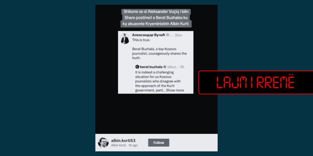 Nëpërmjet një publikimi në median sociale TikTok është pretenduar se presidenti i Serbisë, Aleksandar Vuçiq, i ka shpërndarë në median sociale X (ish-Twitter) postimin e gazetarit Berat Buzhala.