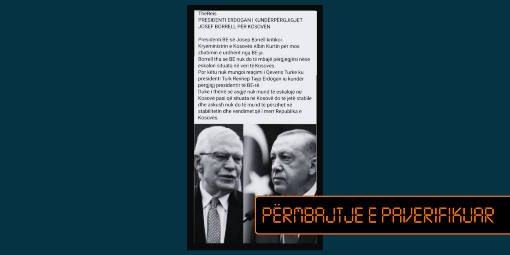 Një llogari në TikTok ka publikuar një material me pretendimin pa fakte se presidenti i Turqisë, Recep Tayyip Erdogan ka reaguar lidhur me deklaratat e përfaqësuesit të Bashkimit Evropian, Josep Borrell, për Kosovën.