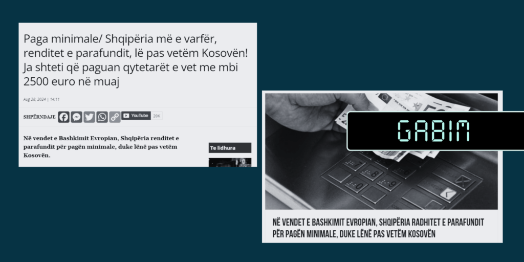 “Në vendet e Bashkimit Evropian, Shqipëria renditet e parafundit për pagën minimale, duke lënë pas vetëm Kosovën”, është pretendimi në hyrje të artikullit të “panorama.com.al”. Kjo është gabim. Shqipëria dhe Kosova nuk janë pjesë të Bashkimit Evropian, e madje edhe lista e publikuar përmban disa shtete që s’janë pjesë e bllokut.