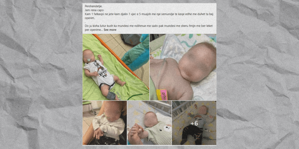 Në mesin e këtyre përmbajtjeve të trajtuara nga hibrid.info, është pretendimi se një foshnje 5 muajsh të sëmurë, e cila ka nevojë për operim. Në postimin e shoqëruar edhe me fotografi të foshnjës, kërkohet ndihmë financiare në realizimin e operacionit. E veçanta e këtij pretendimi është se është hasur në disa raste dhe është trajtuar në tre të tilla, nga hibrid.info (shih këtu, këtu dhe këtu).