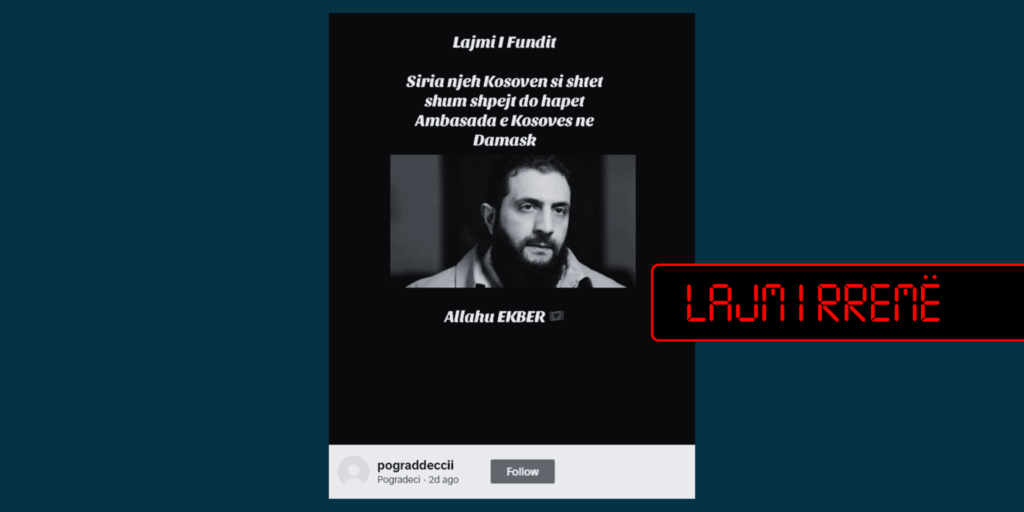 “Lajmi i Fundit. Siria njeh Kosoven si shtet shum shpejt do hapet Ambasada e Kosoves ne Damask”, është mbishkrimi që llogaria “pogradeccii” i ka vënë një fotografie të liderit të ri sirian Ahmed al-Sharaa, në publikimin e bërë më 4 janar.