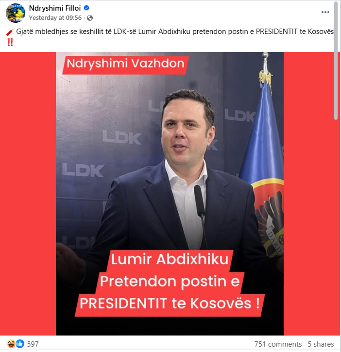 Është publikuar një imazh ku shihet kryetari i LDK-së, Lumir Abdixhiku, me mbishkrimin “Gjatë mbledhjes se keshillit të LDK-së Lumir Abdixhiku pretendon postin e PRESIDENTIT te Kosovës”.