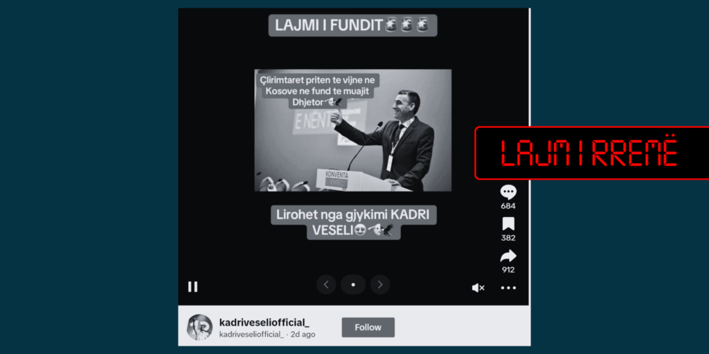 Pas verifikimit të fakteve zbulohet se Gjykata Speciale nuk ka marrë vendim për lirimin e ish-parlamentarit, njëherit ish-kyetarit të PDK-së, Kadri Veseli, i cili bashkë me Hashim Thaçin, Rexhep Selimin dhe Jakup Krasniqin janë në paraburgim në Hagë, nën akuzën për krime lufte.