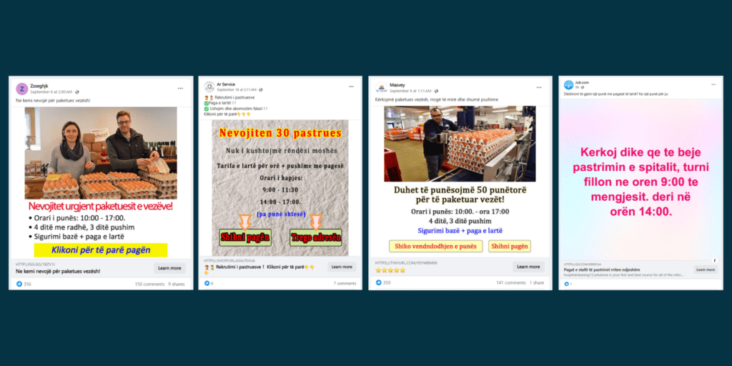 Gjatë monitorimit të përditshëm në rrjetin social Facebook, ekipi i hibrid.info ka identifikuar katër përmbajtje që lidhen me tema sociale, veçanërisht me mundësi punësimi. Këto postime, të cilat në pamje të parë duken si oferta pune të rregullta, pas kontrollit të hollësishëm të fakteve, u zbuluan të jenë përmbajtje mashtruese, duke i drejtuar përdoruesit në ueb-faqe të pasigurta ose pa përmbajtje reale pune.