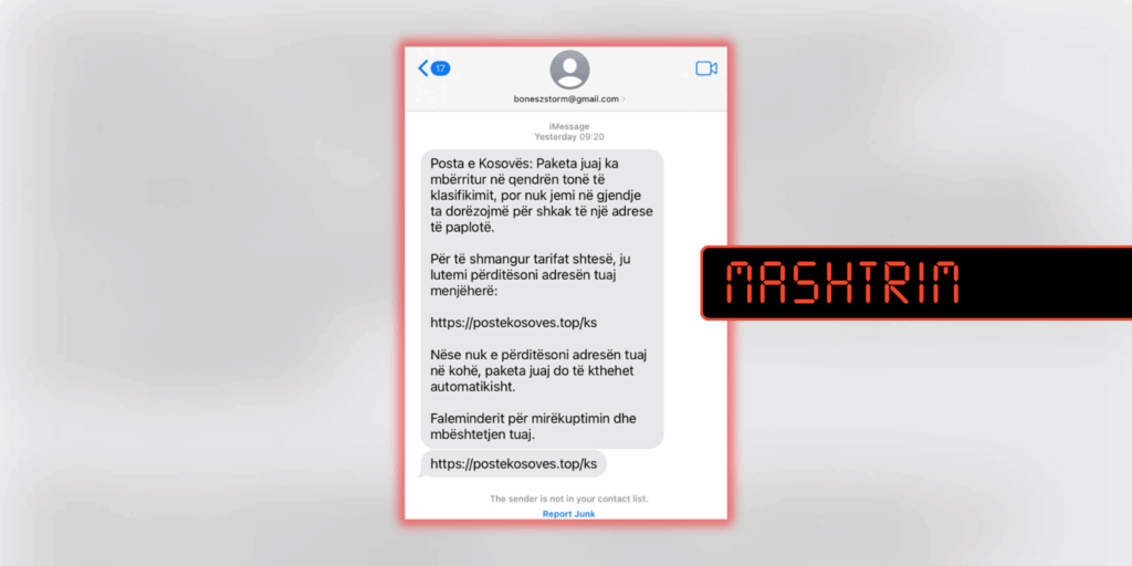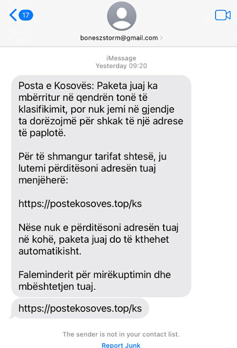 Një SMS i dërguar nga email adresa “boneszstorm@gmail.com”, u ka ardhur në telefona disa qytetarëve me thirrjen që të klikohet në një vegëz në mënyrë që ta ndërrojnë adresën e shtëpisë, për të pranuar gjoja një pako.