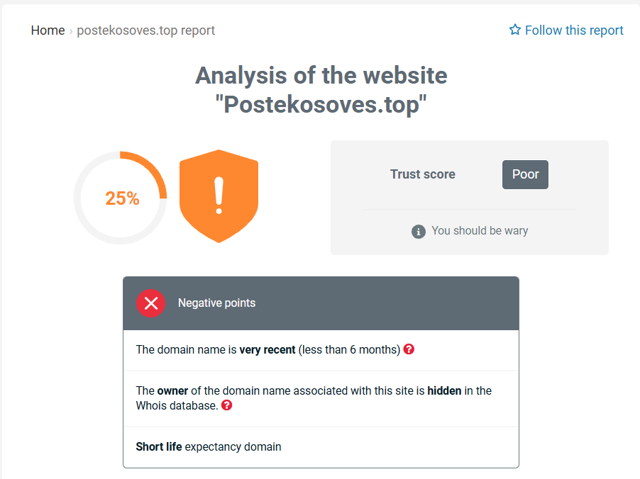 Hibrid.info, duke përdorur platformën online për verifikim të ueb-faqeve “scamdoc.com”, ka gjetur se vegëza (link) që gjendet në SMS është e dyshimtë (shih këtu)