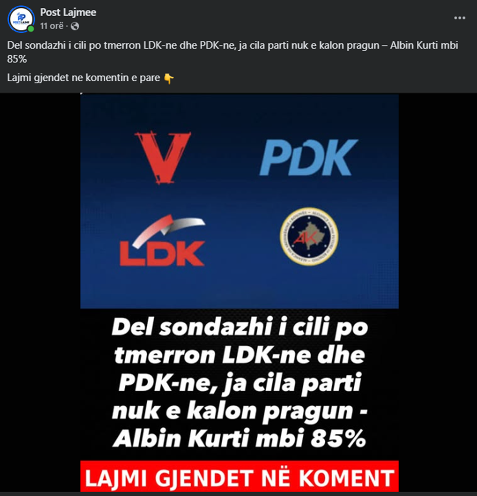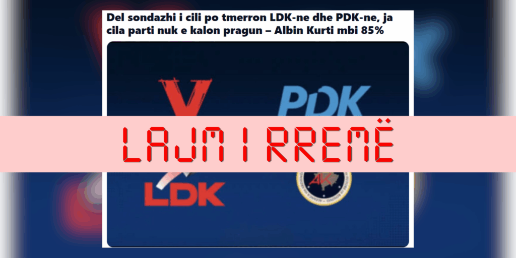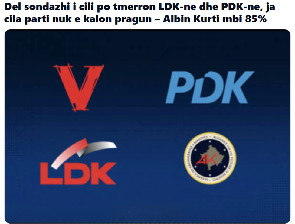 Publikohet një imazh me mbishkrimin “Del sondazhi i cili po tmerron LDK-ne dhe PDK-ne, ja cila parti nuk e kalon pragun – Albin Kurti mbi 85%”.