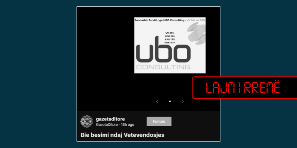 Pas verifikimit të fakteve, u vërtetua se një sondazh i tillë nuk gjendet i publikuar në ueb-faqen zyrtare as në faqen në Facebook të kompanisë UBO Consulting.