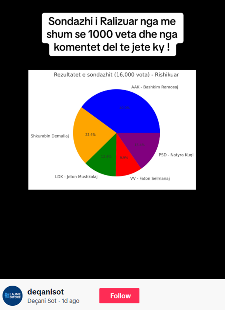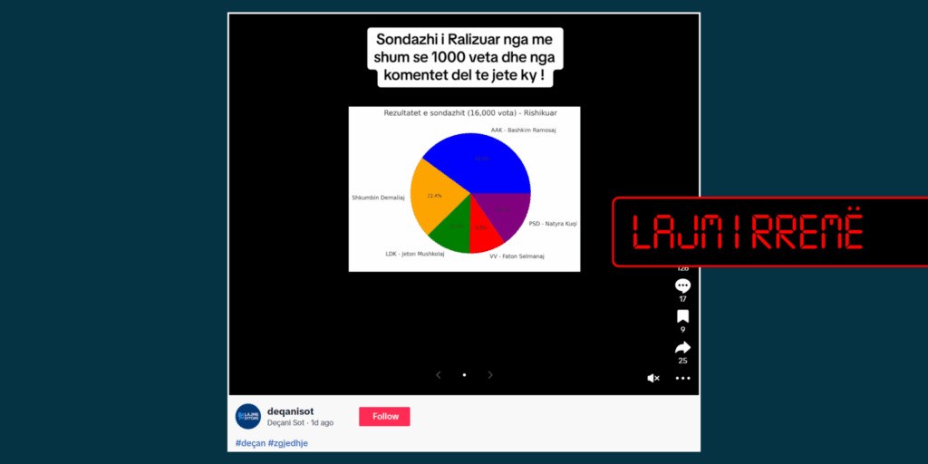 Sondazhi për mbështetjen e kandidatëve për kryetar komune në Deçani, i paraqitur përmes një fotografie nuk është i kredibil.