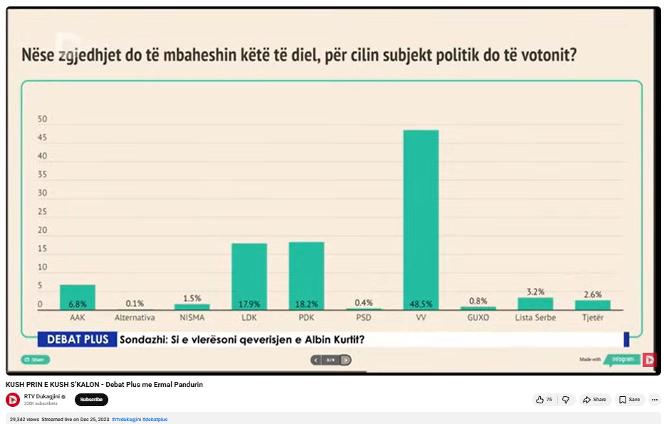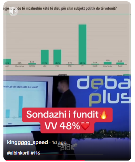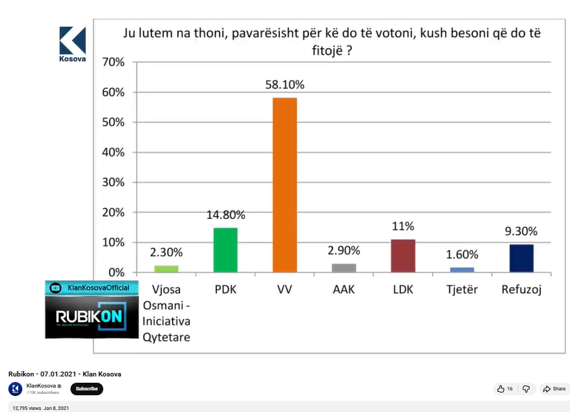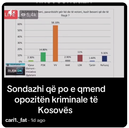 Në përmbajtjen e parë, në bazë të audios dhe asaj që shihet në fotografi, kuptohet se kemi të bëjmë me një sondazh të publikuar në emisionin televiziv “Rubikon”, që transmetohet në televizionin “KlanKosova”.