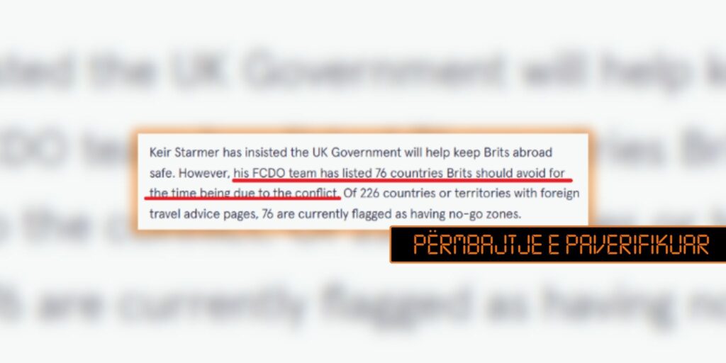 Kjo përmbajtje nuk figuron në artikullin e “BirminghamLive”, ku thuhet: “Zyra e Jashtme, e Komonuelthit dhe Zhvillimit (FCDO) po përditëson vazhdimisht listën e vendeve ku turistët e Mbretërisë së Bashkuar NUK duhet të udhëtojnë për shkak të luftës në Lindjen e Mesme. FCDO ka lëshuar paralajmërime të ndryshme për udhëtime, duke përfshirë këshilla kundër “të gjitha udhëtimeve” dhe “të gjitha udhëtimeve përveç atyre të domosdoshme” në vende të tëra ose pjesë të vendeve”.