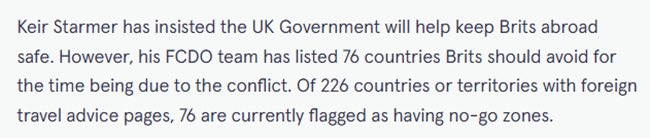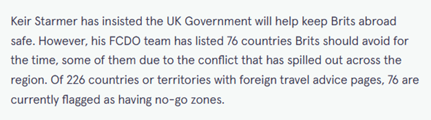 Keir Starmer ka këmbëngulur që Qeveria e Mbretërisë së Bashkuar do të ndihmojë në mbajtjen e britanikëve jashtë vendit të sigurt. Megjithatë, ekipi i tij i FCDO-së ka listuar 76 vende që britanikët duhet t’i shmangin për momentin, disa prej tyre për shkak të konfliktit që është përhapur në të gjithë rajonin”.