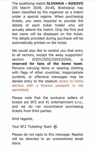 “Do të donim gjithashtu të ju rikujtonim se hyrja në të gjithë sektorët, përpos sektorëve të mbështetësve mysafirë (D201,D202,D203,D204), është e rezervuar për tifozët e ekipit vendës. Personave që bartin gjësende apo veshin rroba me flamuj të vendeve tjera, simbole të papërshtatshme, apo mesazhe ofenduese, mund të ju ndalohet hyrja në stadium (hyrja në sektorin e vendësve me pasaportë të Kosovës nuk lejohet). Ju lutemi vini re se shitësit ekskluzivë të biletave janë SFZ dhe “XL entertainment s.r.o.”, dhe nuk rekomandojmë të bilini bileta nga palë të treta”.