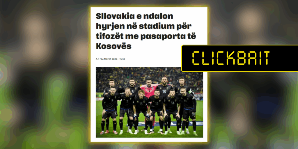 Vetëm pasi të klikohet artikulli, lajmi qartësohet. Në përmbajtje sqarohet se Federata Sllovake e Futbollit ka marrë vendim për t’ua ndaluar hyrjen shtetasve të Kosovës në sektorët e tifozëve vendës, për ndeshjen e play-offit mes Sllovakisë dhe Kosovës, e cila pritet të zhvillohet të enjten mbrëma në Bratisllavë në kuadër kualifikimeve për Kampionatin Botëror 2026.