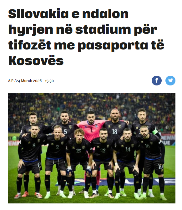 Portali informativ “kosova-sot.info” ka publikuar të mërkurën (25 mars) artikullin me titull “Sllovakia e ndalon hyrjen në stadium për tifozët me pasaporta të Kosovës”.