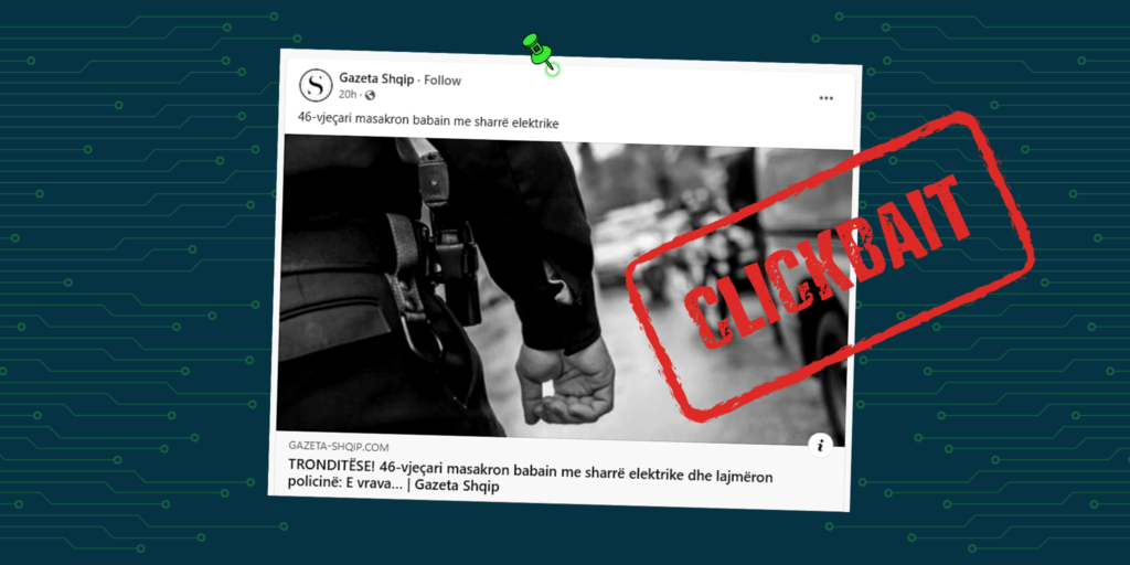 “Clickbait” vlerësohen ato përmbajtje informative titulli i të cilave është përgjithësues dhe nuk bënë të ditur vendndodhjen e ngjarjes, kontekstin dhe relevancën. Tekste dhe artikuj të tillë synojnë të tërheqin vëmendjen e audiencës me tituj sensacionalë me pasojë çorientuese, që nuk e qartësojnë saktësisht përmbajtjen e artikullit. Titujt “clickbait” bëhen kryesisht për të tërhequr lexueshmëri në rastin e publikimeve mediatike dhe/ose për të fituar nga klikimet në rastet e publikimeve komerciale.