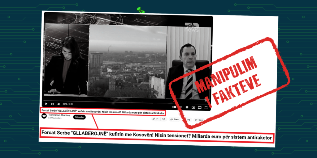 Televizioni “Top Channel” në kanalin zyrtar në Youtube ka publikuar emisionin “Breaking me Fiori Dardha”, në titullin e së cilit shkruan “Forcat Serbe ‘GLLABËROJNË’ kufirin me Kosovën! Nisin tensionet? Miliarda euro për sistem antiraketor”.
