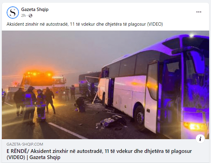 Portali informativ “gazetashqip.com” ka publikuar një artikull me titullin “E RËNDË/ Aksident zinxhir në autostradë, 11 të vdekur dhe dhjetëra të plagosur”.