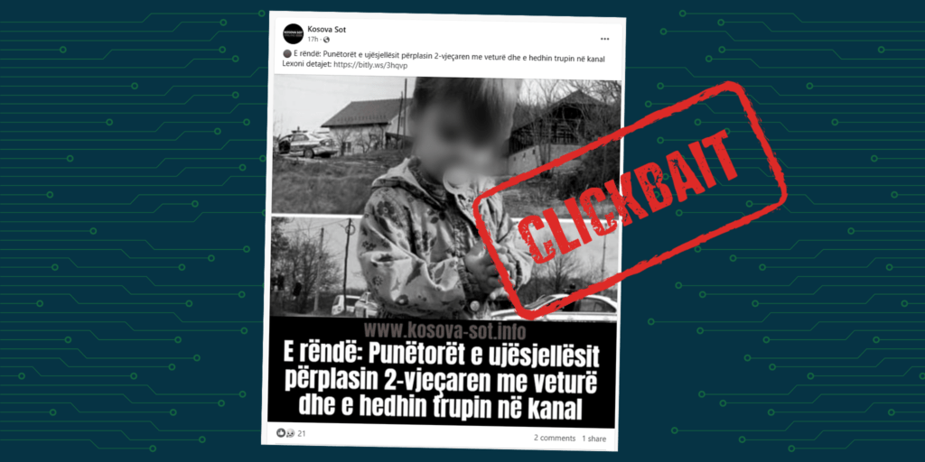 Portali informativ “Kosova-sot.info” ka publikuar një artikull në Facebook lidhur me vrasjen e një fëmije nga punëtorët e ujësjellësit, por që në titull nuk ka sqaruar se ngjarja ka ndodhur në Serbi.