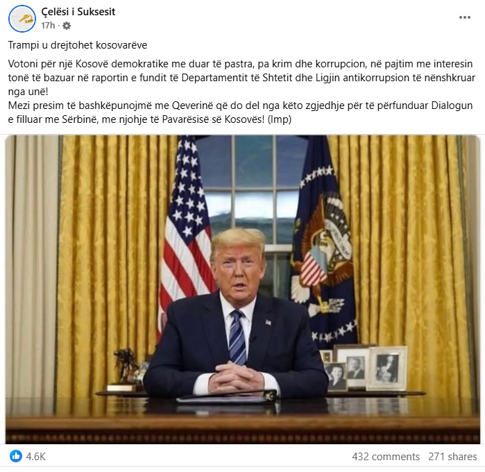 Përmes një postimi të publikuar të shtunën (27 dhjetor) në Facebook nga faqja “Çelësi i Suksesit”, pretendohet se presidenti amerikan Donald Trump u është drejtuar qytetarëve të Kosovës, duke i ftuar të votojnë për një Kosovë demokratike, pa krim dhe korrupsion.