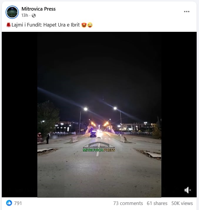 Publikohet një video-material ku shfaqen pamje duke u zhbllokuar hyrja para një ure, me mbishkrimin “Lajmi i Fundit: Hapet Ura e Ibrit”.