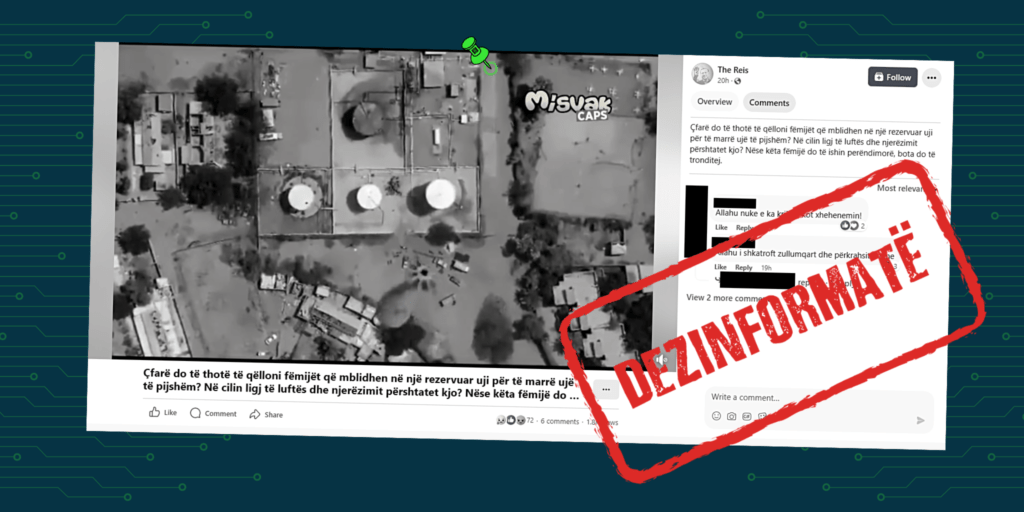 Faqja në Facebook me përmbajtje në gjuhën shqipe “The Reis” ka publikuar dje (23 tetor) një video-material me pretendimin se pamjet paraqesin bombardimet e një rezervuari uji, afër të cilit shihen disa fëmijë.
