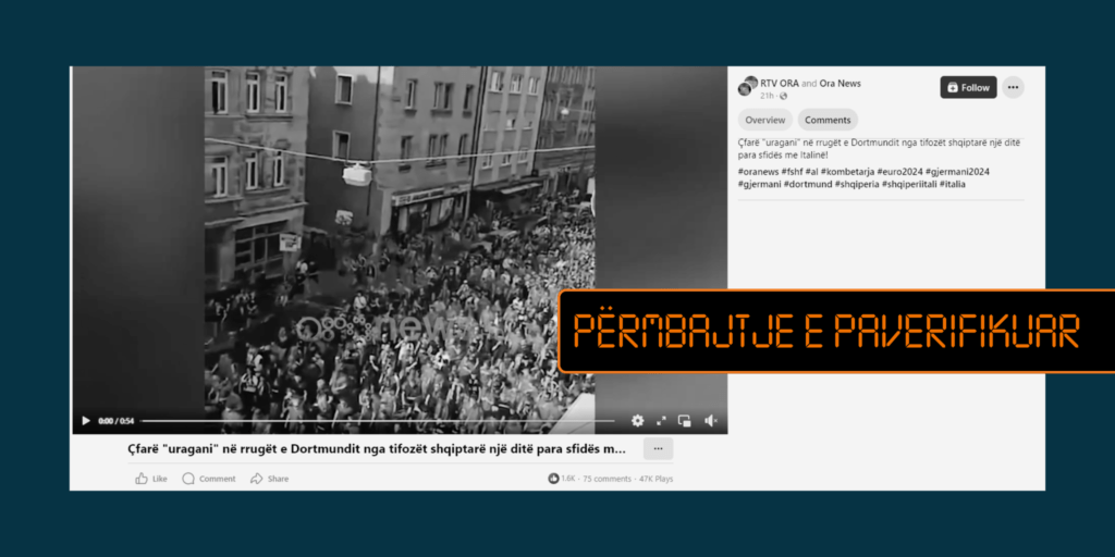 Mediumi në gjuhën shqipe, “oranews.tv” ka publikuar një video-material përmes së cilit ka pretenduar se bëhet fjalë për turmë të tifozëve shqiptarë në Dortmund, një ditë para ndeshjes Shqipëri-Itali në Kampionatin Evropian “Euro 2024”.