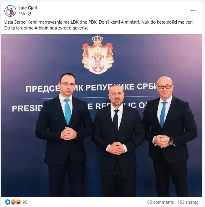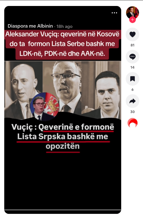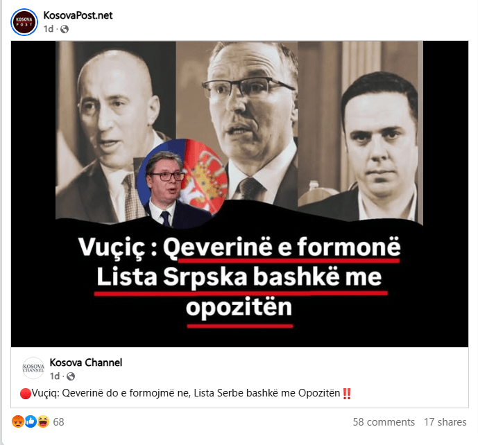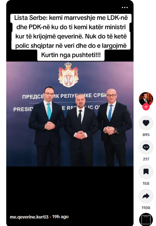 Në këtë llogari është publikuar një fotografi ku shfaqen tre kandidatë potencialë për kryeministër nga partitë opozitare: Bedri Hamza nga PDK, Lumir Abdixhiku nga LDK dhe Ramush Haradinaj nga AAK, së bashku me një imazh të presidentit serb Aleksandar Vuçiq. Në këtë postim është vendosur mbishkrimi: “Vuçiç: Qeverinë e formon Lista Srpska bashkë me opozitën”, duke krijuar përshtypjen e një deklarate të drejtpërdrejtë që nuk është konfirmuar nga asnjë burim zyrtar.